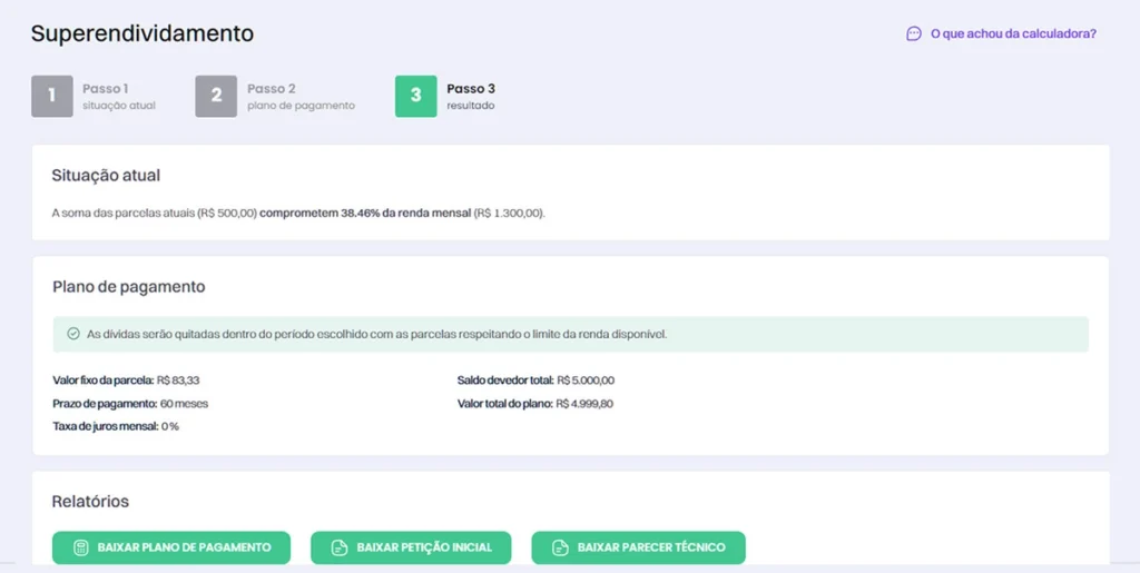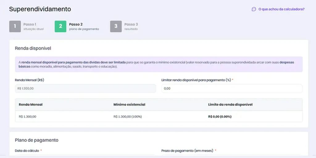 A calculadora propõe um plano de pagamento que caiba dentro do orçamento da pessoa superendividada, preservando o seu mínimo existencial e limitando o valor mensal da parcela àquele que for possível pagar. Nesse caso, a calculadora sugere que valor remanescente seja levado para discussão em juízo junto ao(s) credor(es).