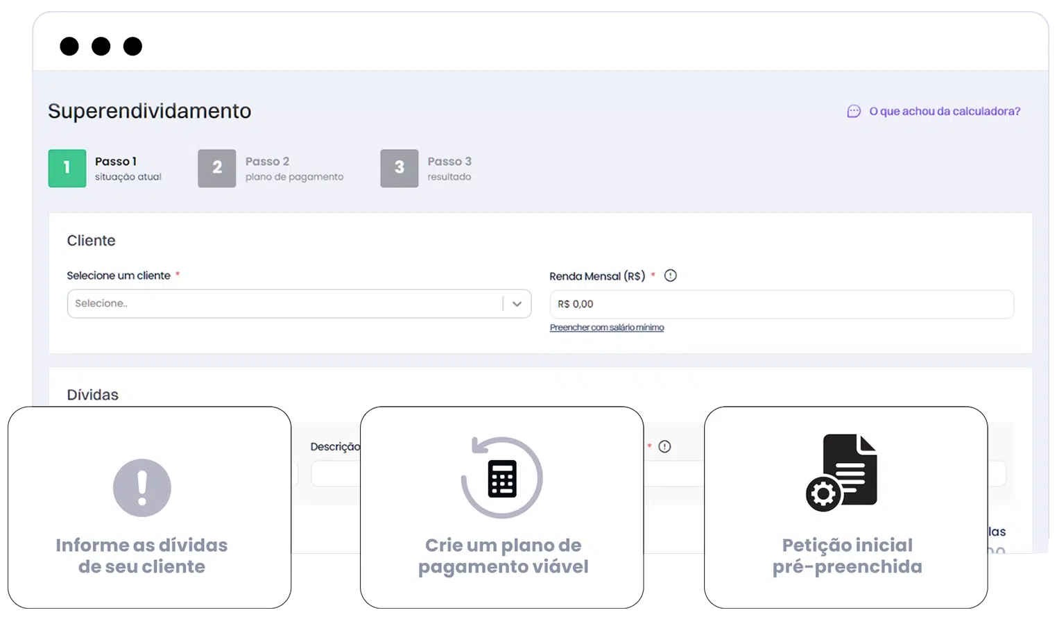 Em até cinco minutos, descubra se seu cliente está superendividado, simule diversos planos de pagamento e já receba uma petição para dar entrada ao processo