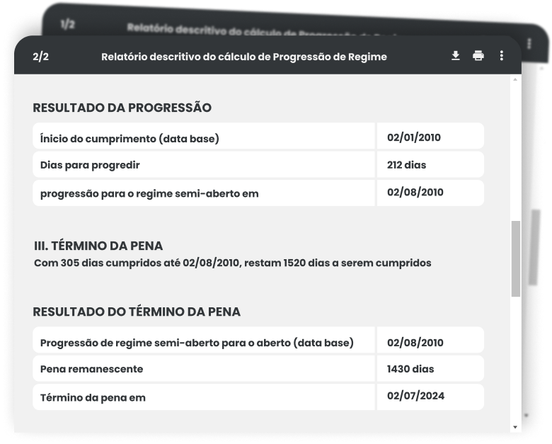 Tenha os cálculos das melhores datas para a progressão de regime do seu cliente em menos de 5 minutos. Acompanhe a execução penal levando em conta fatores como remição, detração, interrupção e faltas graves, tudo de forma automática e precisa.
