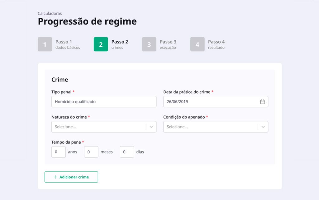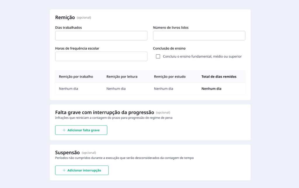 Neste passo, você poderá adicionar remição, faltas graves que interrompem a contagem da progressão e períodos de suspensão. Todos são opcionais. Clique em “Calcular” ao final da tela caso não precise incluir nenhum deles.