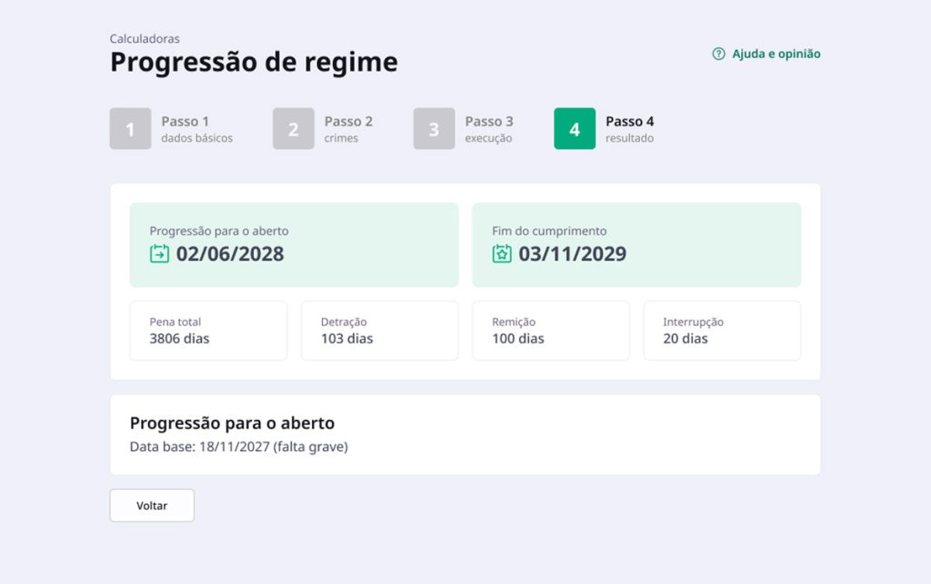 Na tela de resultado, você terá acesso às datas de progressão e de fim do cumprimento previstas com os dados adicionados nos passos anteriores. Também informamos todos os dias de detração, remição e suspensão calculados e se a data base foi alterada por alguma falta grave.