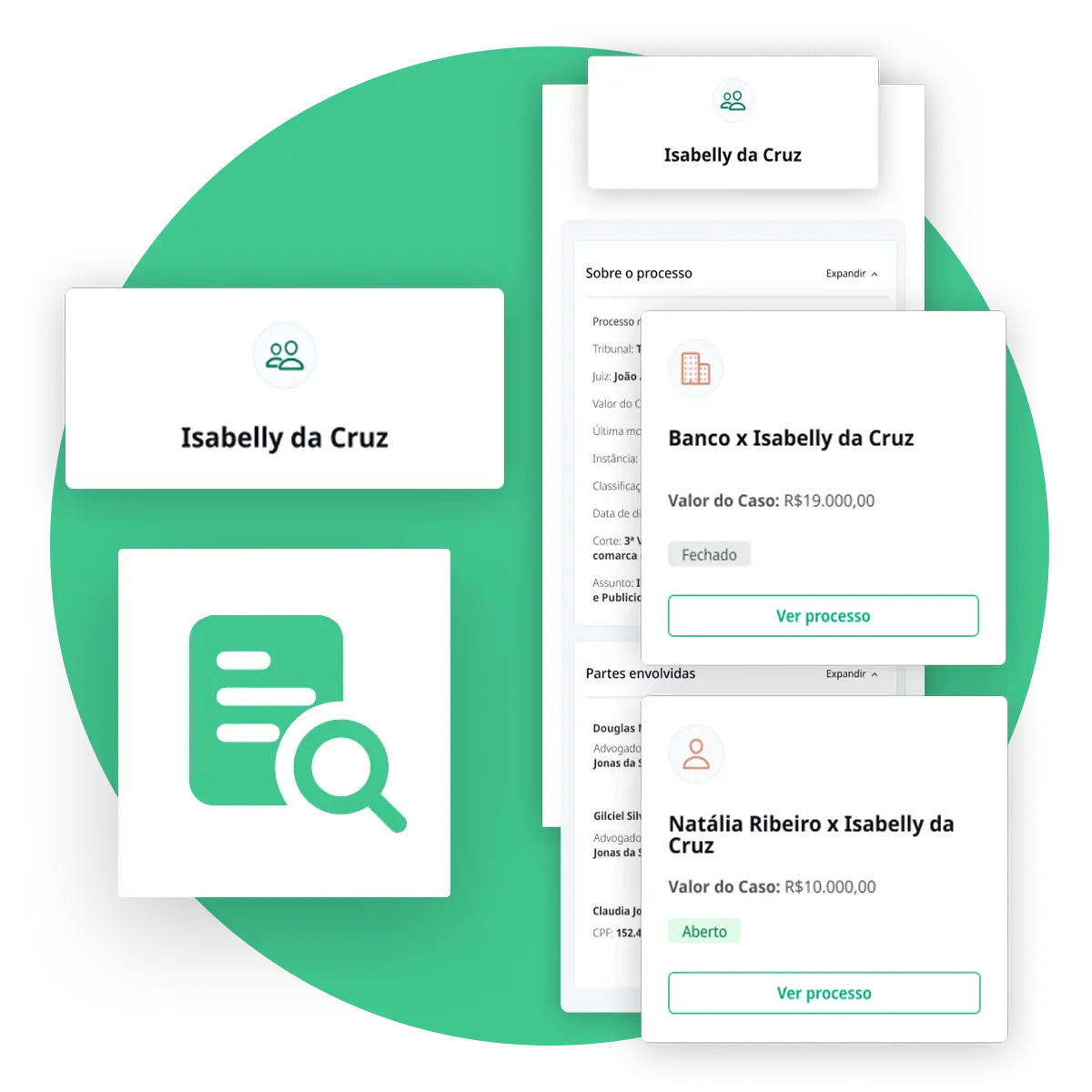 Permite a busca de processos e informações tanto de clientes quanto da parte contrária