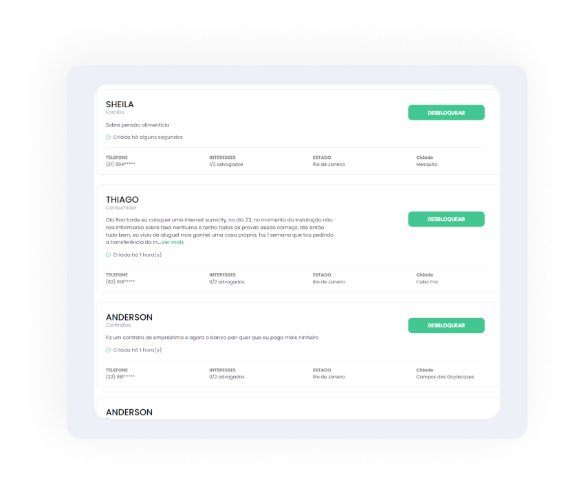São centenas de consultas diárias feitas por potenciais clientes, todos os dias, em nossa plataforma. E você pode usar os filtros de especialidades jurídicas, entre outros, para encontrar as melhores oportunidades disponíveis.