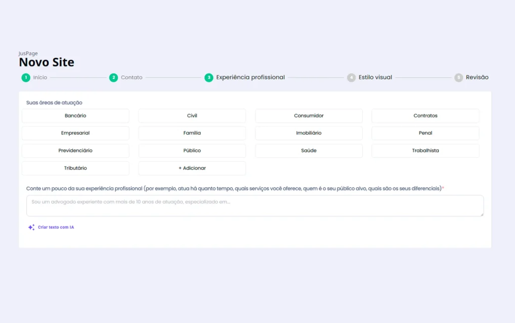 Transforme sua presença digital com a JusPage, que combina Inteligência Artificial e facilidade para criar sites profissionais, acessíveis e conectados ao ecossistema Jusfy.