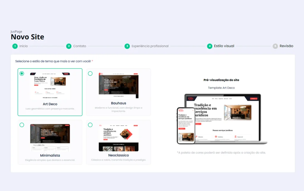 Selecione o tema e o estilo visual que mais combinam com sua marca pessoal, transmitindo profissionalismo e confiança aos visitantes.