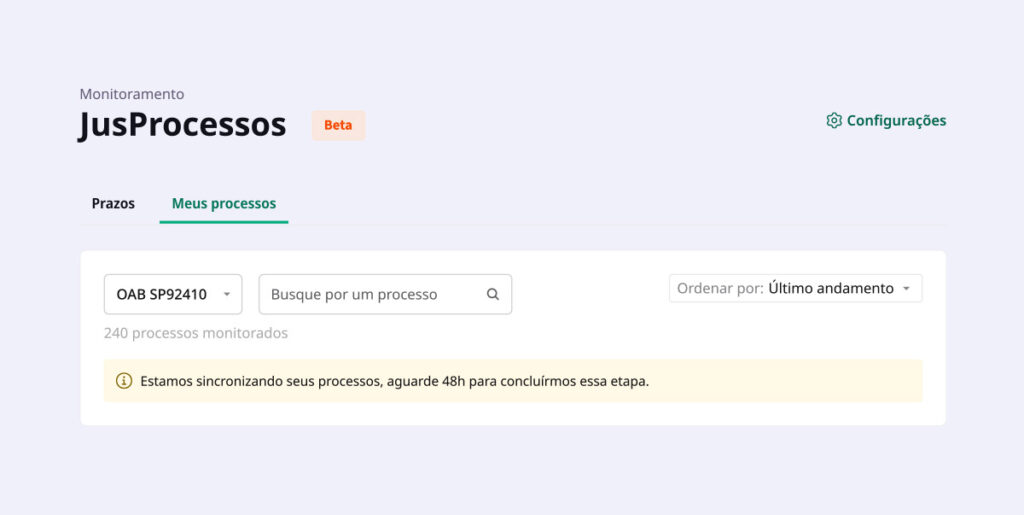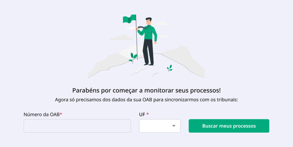 Insira o número da sua OAB e UF na plataforma e, em até 48 horas, você terá acesso a todos os seus processos judiciais de forma organizada e centralizada.