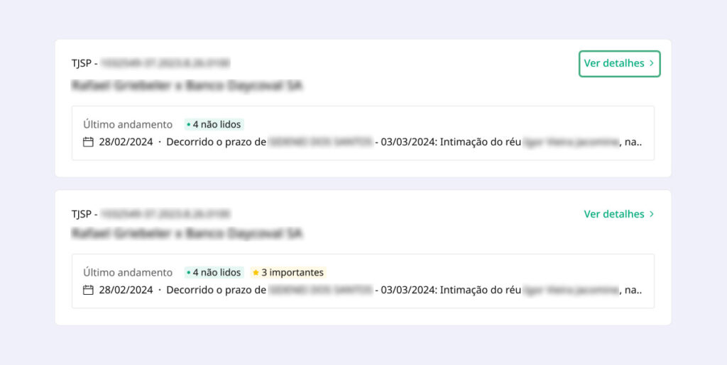 Clique em “Ver Detalhes” para acessar informações detalhadas do processo, como histórico completo, últimas movimentações e prazos importantes.