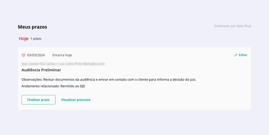 Configure alertas e crie prazos diretamente na plataforma para garantir que você nunca perca uma data importante. Mantenha todos os seus compromissos processuais sob controle.