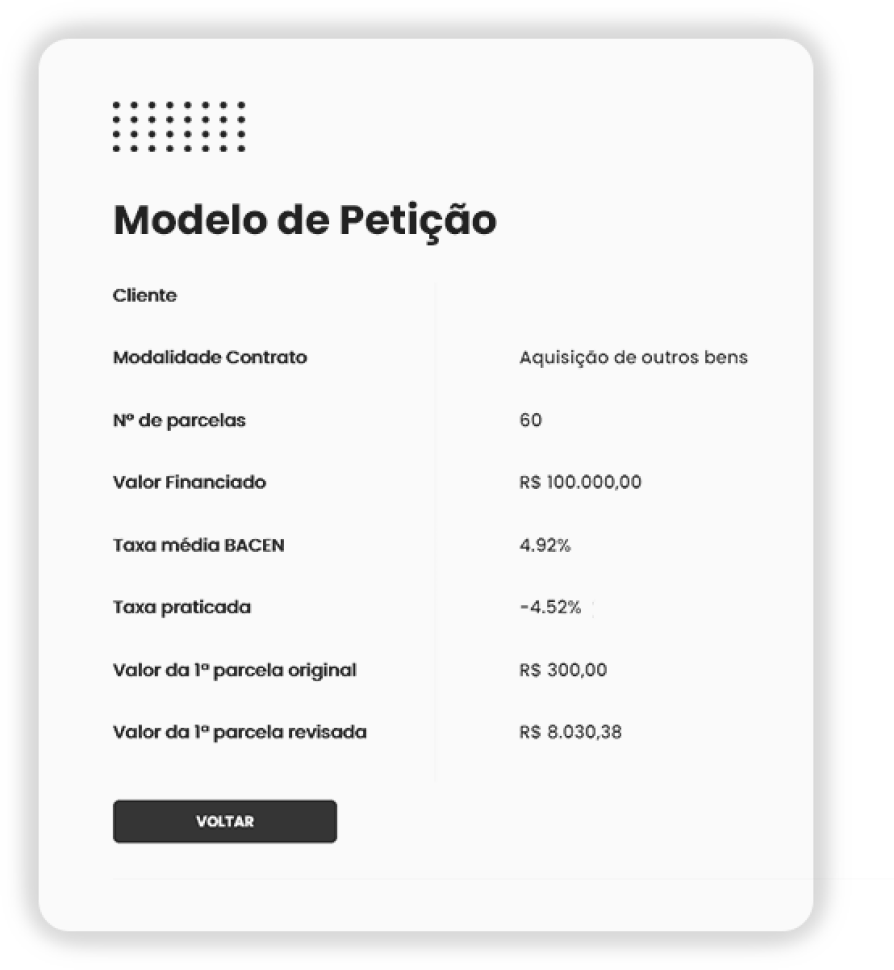 Não importa que contrato precisa revisar, ou quando ele foi assinado. JusRevisional encontra a taxa certa e calcula o refinanciamento. Ela até aponta o percentual de sucesso de uma ação. Você só precisa preencher os campos e dar alguns cliques.