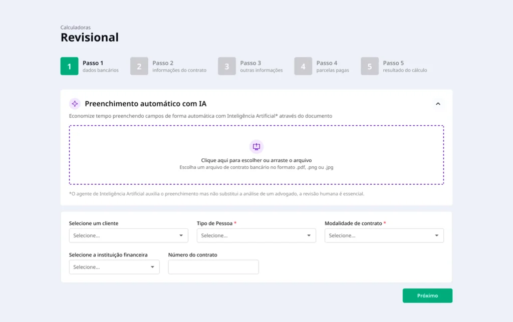 O preenchimento automático por IA é uma novidade da Calculadora Revisional da Jusfy que permite agilizar todo o processo de revisão de contratos. Basta anexar o contrato e nossa inteligência artificial lê o documento, identificando e preenchendo automaticamente todos os campos necessários para o cálculo revisional.
