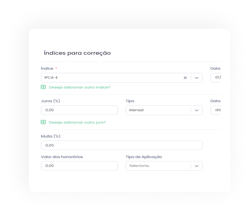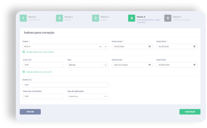 Agora é hora de informar os dados necessários para a realização do cálculo, além de escolher o índice e a taxa de juros. Você também pode aplicar mais de uma taxa de juros, se necessário.