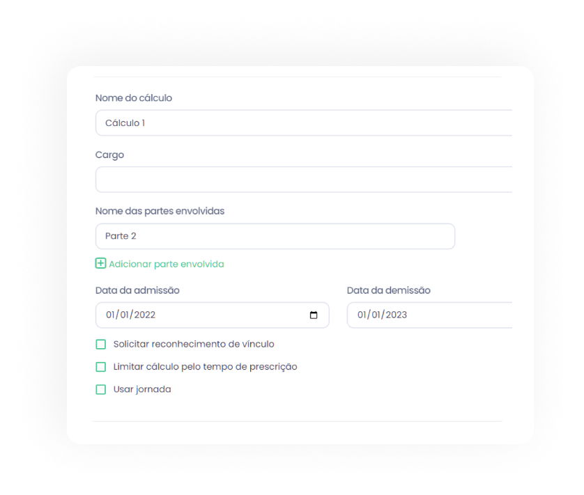 Sim… a primeira etapa do cálculo consiste em preencher os dados das partes envolvidas e dar um nome ao próprio cálculo para que ele possa ser revisitado no futuro, evitando que as informações precisem ser inseridas novamente.